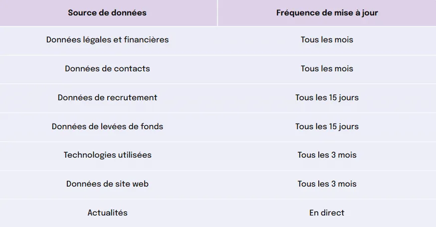 - Des données précises et vérifiées (effectifs, code NAF, SIREN/SIRET, levées de fonds, recrutements).