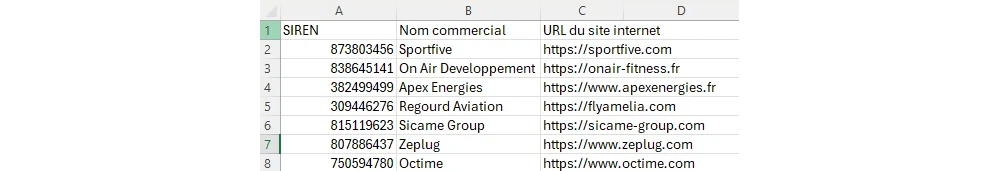 - Import complet : SIREN, site web, LinkedIn, nom commercial, email du prospect, nom du prospect