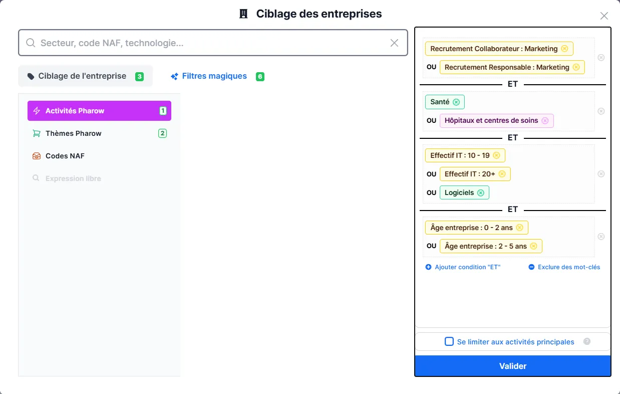 Grâce aux filtres magiques, vous combinez librement des conditions ET et OU pour affiner vos segments, et croiser des données légales, sectorielles et business signals (croissance, recrutements, levées de fonds…) en quelques clics.