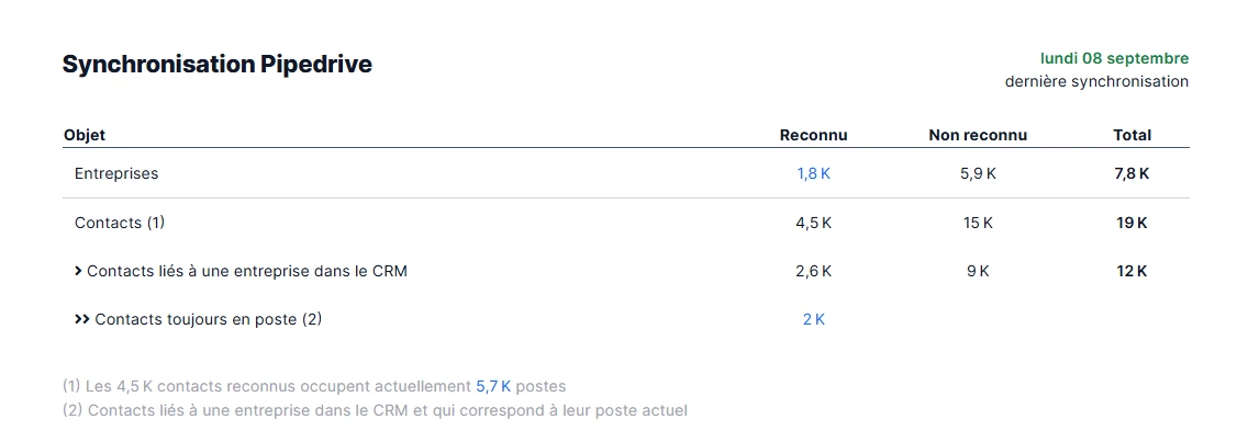 - Vous pouvez pousser des contacts dans HubSpot/Pipedrive et suivre les activités.