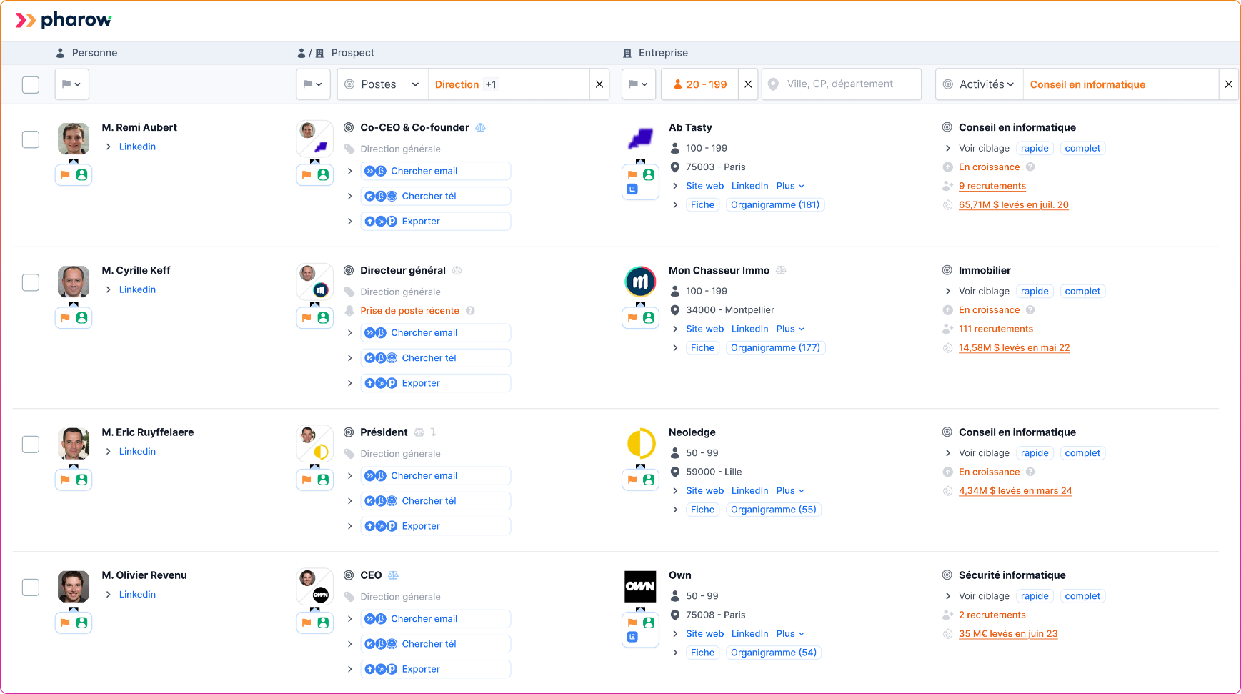 Pharow réconcilie toutes les sources de données, l'intent data et les signaux d'affaires sur les sociétés et les prospects B2B en France pour créer des listes segmentées, les enrichir (email, téléphone) et les exporter dans votre CRM et outil d’envoi.