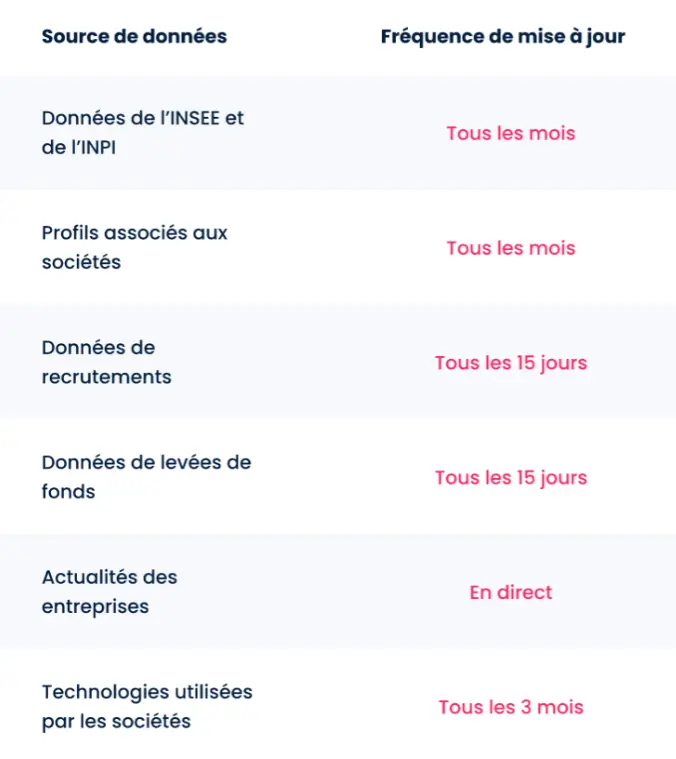- tous les 15 jours pour les signaux d’activité (recrutements, levées de fonds, croissance),