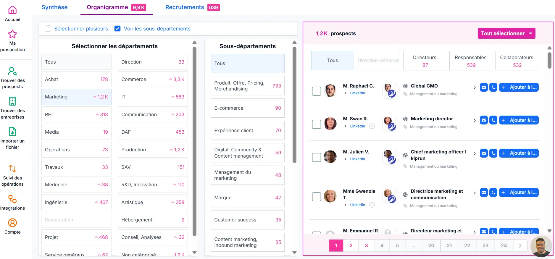 L'organigramme dans Pharow donne accès en un clic à la structure interne de chaque entreprise : départements, sous-départements et niveau hiérarchique. Prenez le département Marketing : Pharow le décompose immédiatement en sous-départements (E-commerce, Expérience client, Digital & Community, Management du marketing, Marque...) et par niveau hiérarchique (Directeurs, Responsables, Collaborateurs). Sur une entreprise avec 1 200 profils Marketing, vous pouvez isoler les 87 directeurs en deux clics, sans fouiller contact par contact.