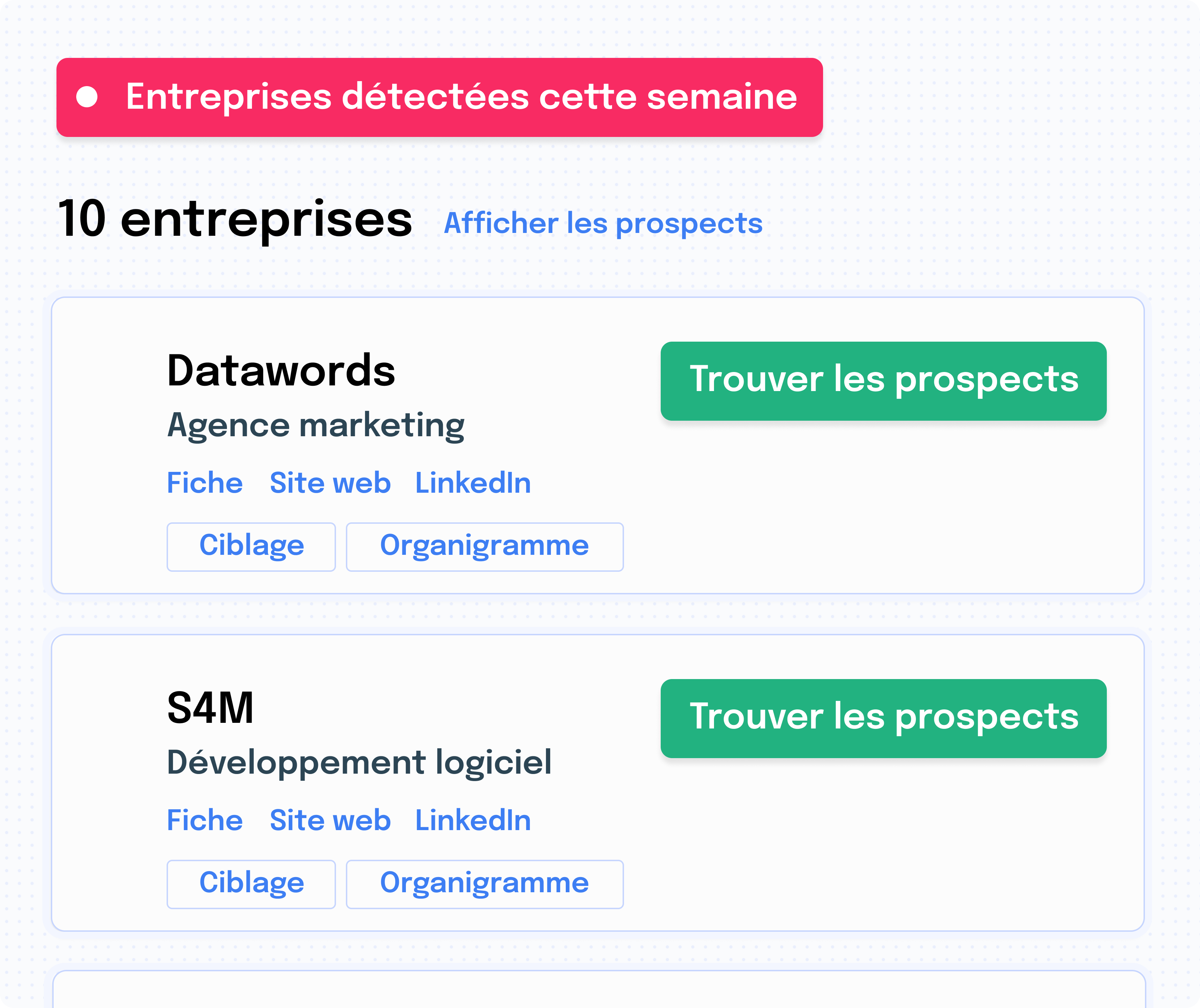 Chaque semaine, vous recevez la liste des entreprises identifiées avec toutes leurs données légales, web, financières, technologies, recrutements en cours.