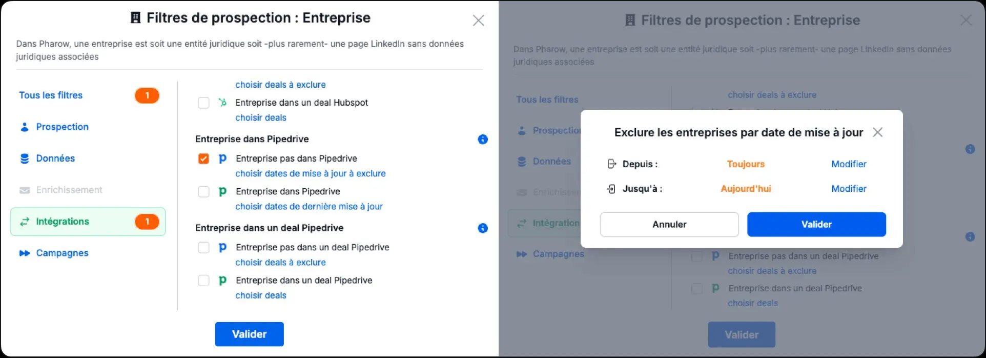 Grâce à la connexion bidirectionnelle native avec HubSpot et Pipedrive, ou grâce au webhook, Pharow synchronise automatiquement votre CRM. En suivant le tutoriel ci-dessus, vous filtrez directement vos clients existants, identifiez les comptes à exclure de vos campagnes ou ciblez ceux prêts pour de l'upsell, le tout en quelques clics.