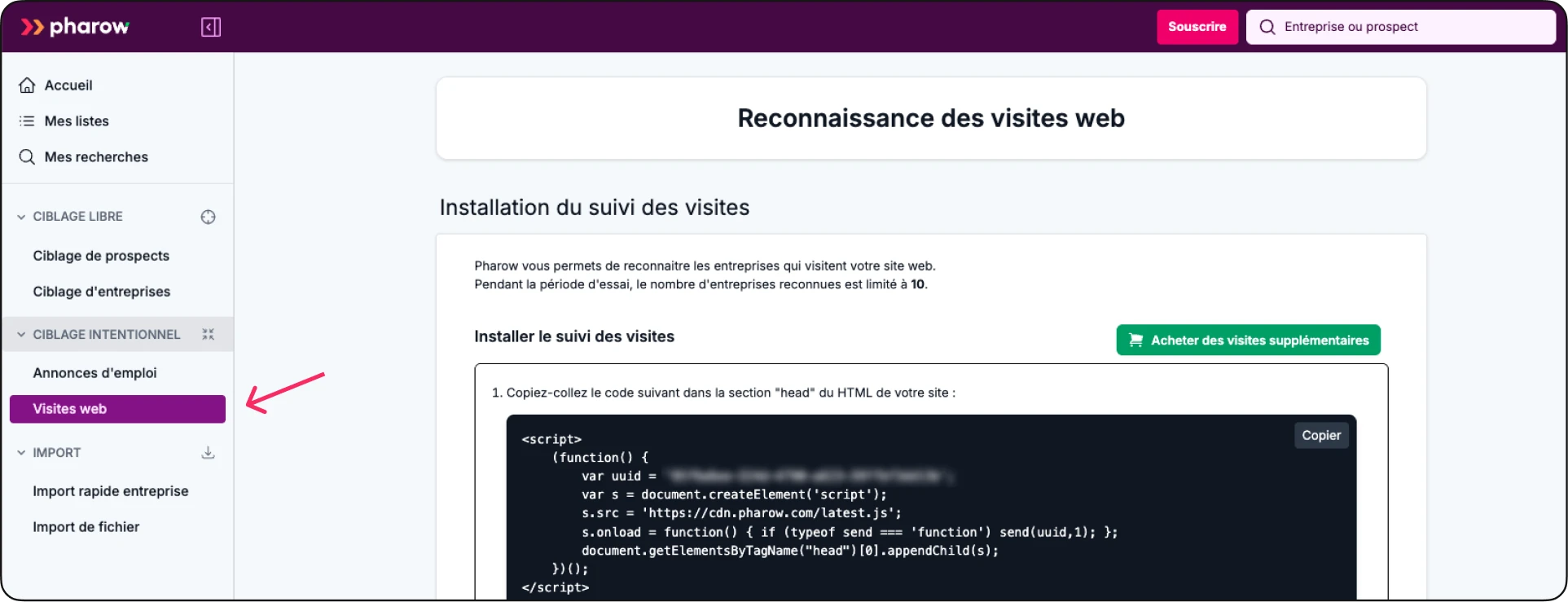 Cette page vous montre comment cibler facilement vos prospects avec les visites de site web grâce à Pharow, pour combiner ce filtre avec d'autres critères (secteurs, décisionnaires, effectifs, technologies, croissance, etc.) afin de construire une segmentation exploitable en quelques clics.