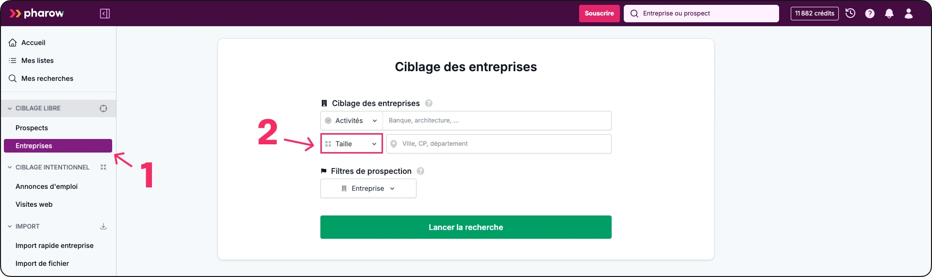 Cette page vous montre comment filtrer facilement les tailles d'effectif avec Pharow, pour combiner la taille d'un compte avec d'autres critères (secteurs, croissance, technologies, etc.) afin de construire une segmentation exploitable en quelques clics.