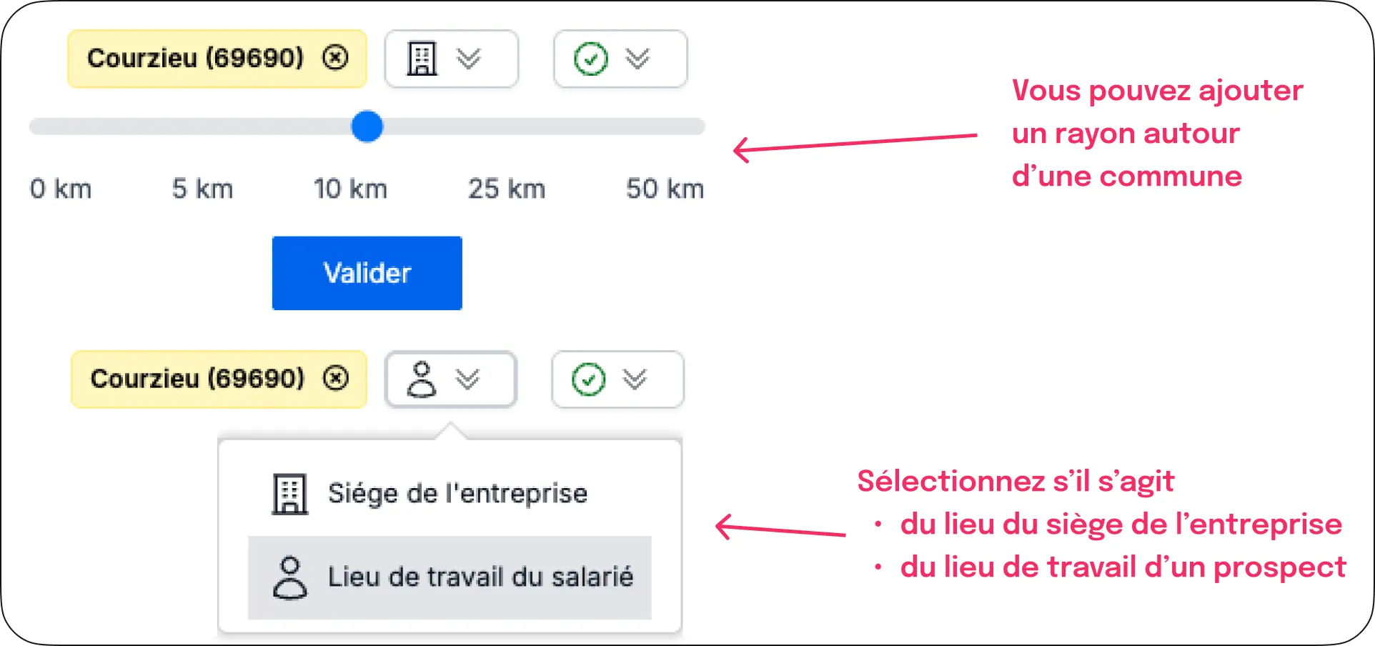 - Vous pouvez choisir de cibler le lieu du siège d'une entreprise ou le lieu de travail d'un prospect